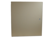 The 24268W-UL is an exterior surface-mounted enclosure designed to house and protect low-voltage telecommunications wiring and equipment. The enclosure includes a 3/4" plywood backboard and 4-position, #4-14 wire ground bar mounted inside, and features 2 knockouts 7/8" to 2-1/2" (for 3/4" to 2" conduit) & 10 knockouts 7/8" to 1-3/4" (for 3/4" to 1-1/2" conduit). Made of 16-gauge zinc-coated steel with a desert tan powder coat finish with a reinforced hinged door with 7/16" recessed hex latch. "COMMUNICATIONS" embossed on the door, UL-Listed (UL1863), and designed to NEMA 3R.
